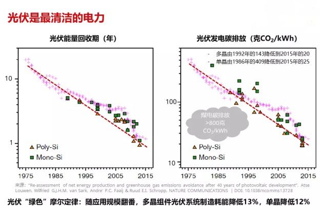 ◎太阳能资源:取之不尽,大约40分钟照射在地球上的太阳能,便足以供全球人类一年能量的消耗。经过几十年发展,光伏的能源和环保潜力越来越突出。光伏能源回收期目前在1年左右(图1),光伏组件可使用20-30年。光伏碳排放量已达20g/kwh左右,而煤电碳排放量大于800g/kwh(图2)。